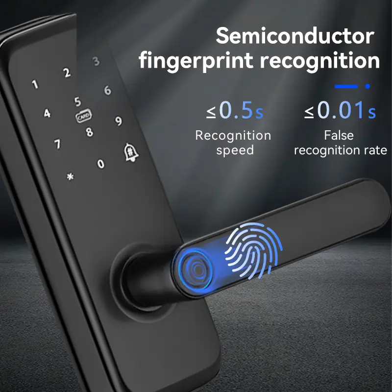 Tento Smart Deadbolt vybavený polovodičovým snímačom odtlačkov prstov a nezávislým algoritmom sa prispôsobuje zmenám odtlačkov prstov a odomyká sa jedným dotykom. Senzor je integrovaný do rukoväte: zablokovanie tlaku smerom nahor, odblokovanie tlaku smerom nadol, prispôsobenie každodenným návykom.